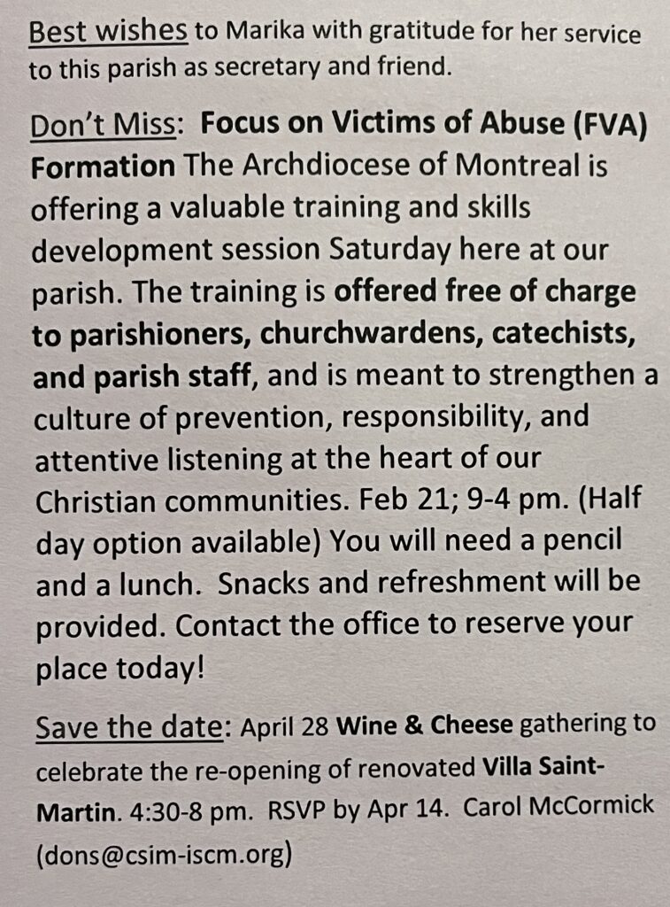 Upcoming Events Saturday, February 21- For Victims of Violence and Abuse workshop @ parish hall 9am-4pm